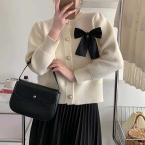 温柔风纯色长袖针织开衫女外搭上衣2022秋冬新款短...