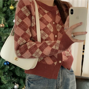 棋盘格毛衣女春秋2022年新款设计感小众外套v领开...