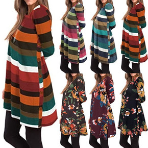 eBay亚马逊新款女装外贸圆领长袖纽扣彩色条纹斜下...