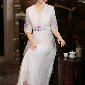 春夏新款民族风连衣裙复古V领腰带绣花修身款大码显瘦...