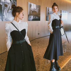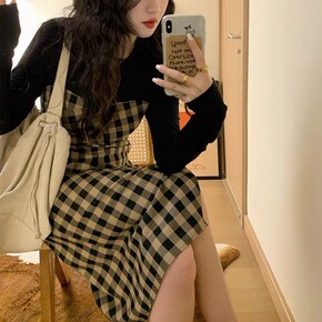 2022春秋复古高级感拼接格子连衣裙设计感收腰显瘦...