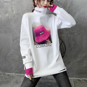 韩版印花高领德绒白色T恤女秋冬2021新款下摆破洞...