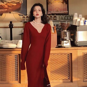 复古红针织包臀裙2021秋冬新款收腰显瘦气质V领中...