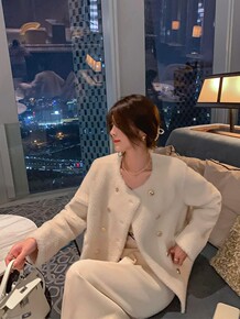 2021新款颗粒全羊毛小香圆领羊羔毛外套女中长款年...