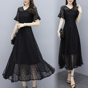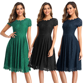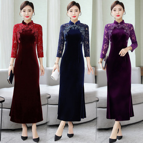 2020新款贵夫人丝绒蕾丝拼接连衣裙气质中年妈妈装...