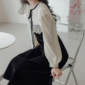 裙子女秋冬连衣裙2021新款韩系内搭收腰蕾丝拼接针...