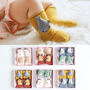 秋冬2双组礼盒宝宝袜子卡通婴儿松口防滑中筒袜新生儿...