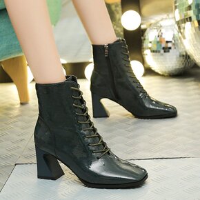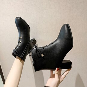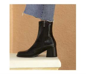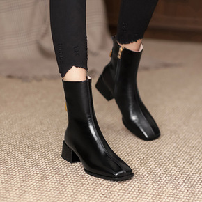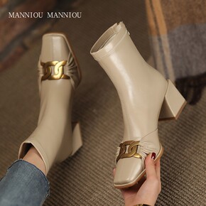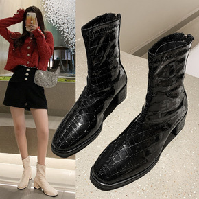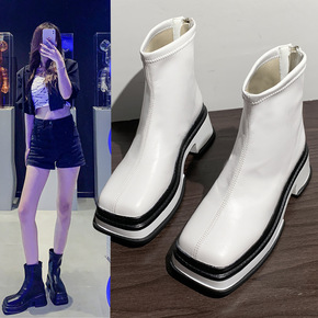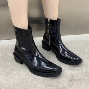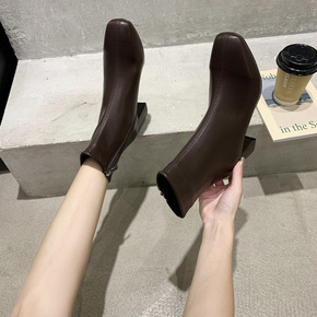 2021欧洲站网红秋季新款女鞋短筒方头粗跟高跟拉链...