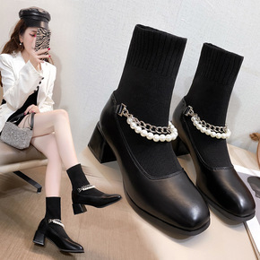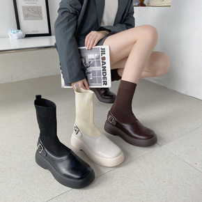 厚底皮带扣弹力袜子靴女2021秋季新款英伦风方头粗...