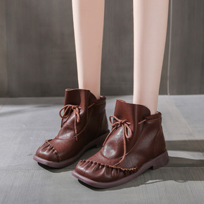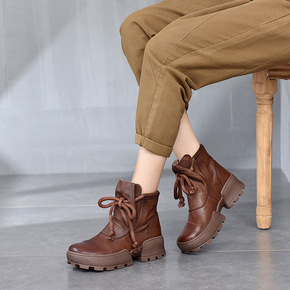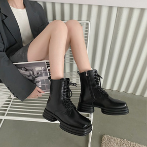 复古女鞋2021秋冬新款女式皮靴松糕跟方头真皮单靴...