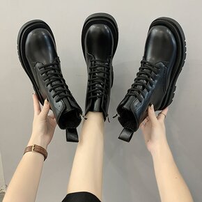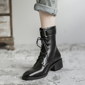 马丁靴女2021新款粗跟系带后拉链瘦瘦靴秋款冬切尔...