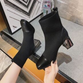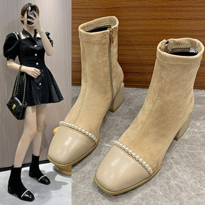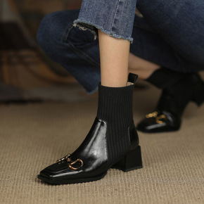 2021新款方头针织拼接短靴女马丁靴时尚瘦瘦袜靴粗...