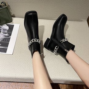 链条时装短靴女2021秋冬季新款高跟马丁靴女时尚后...