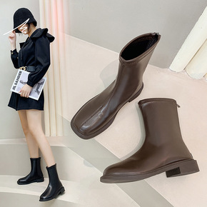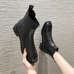 方头短靴女2021春秋新款皮面瘦瘦靴欧美风切尔西靴...
