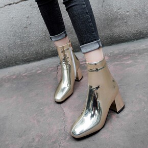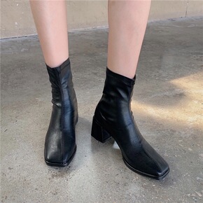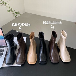 粗跟方头短靴女2021秋冬新款欧美时尚瘦瘦靴高跟时...