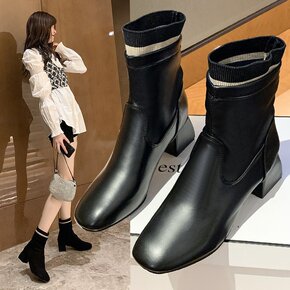 瘦瘦靴女2021年新款方头弹力粗跟马丁靴春秋冬季单...