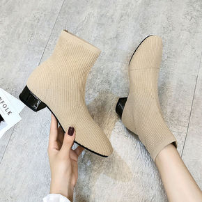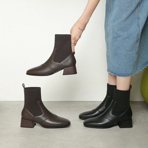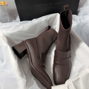 2022秋冬新款复古方头瘦瘦靴针织袜靴短靴女中跟马...