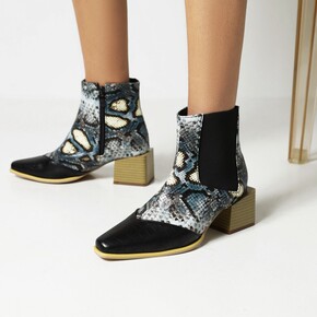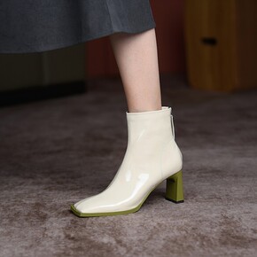 方头拼色中跟短靴女2022年秋冬新款粗跟软皮短筒后...