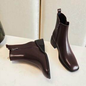 2022秋季方头短靴女粗跟靴透气时装靴短筒软底切尔...