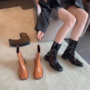 靴子夏款女粗跟方头复古棕色漆皮中跟新款马丁靴炸街瘦...