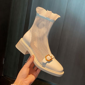 白色马丁靴女2022春夏镂空凉靴方头低跟皮带扣网靴...