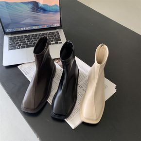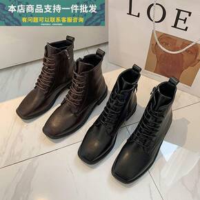 2022秋冬新款马丁靴女韩版方头粗跟后拉链休闲纯色...