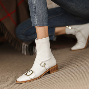 英伦拼接皮带扣方头玛丽珍弹力靴2021秋新款牛皮低...