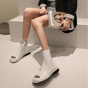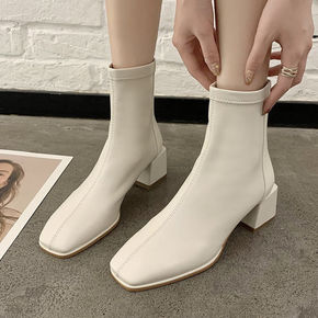 方头短筒马丁靴女2021新款秋季粗跟增高气质白色瘦...