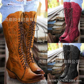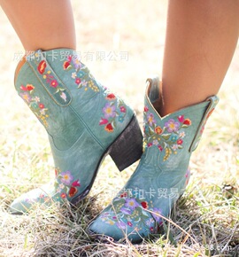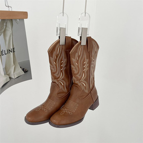 何穗同款粗跟百搭西部牛仔靴V口刺绣套筒骑士靴复古中...