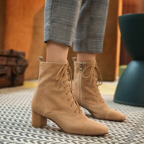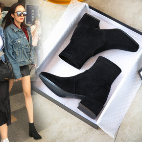 SW绒面靴子女短靴2022新款春秋单靴粗跟中跟瘦瘦...