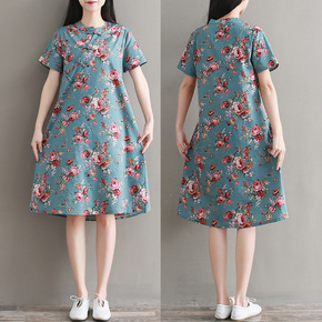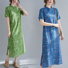 文艺风棉麻印花盘扣立领短袖旗袍连衣裙女中长款202...