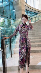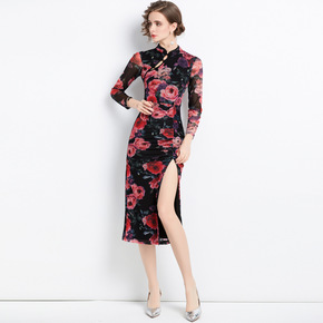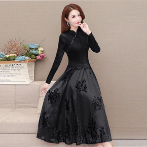 开雨2021年秋冬新款摆黑网格亮片长袖中长旗袍妈妈...
