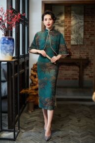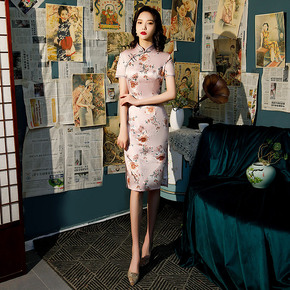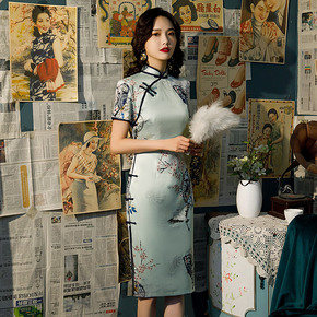 红眸2021春夏新款仿花罗旗袍连衣裙三分袖中长宽边...
