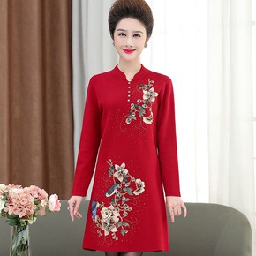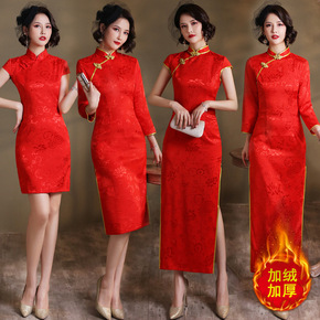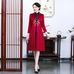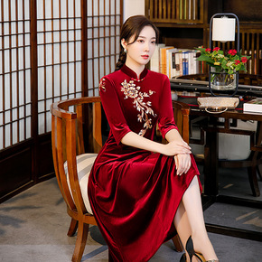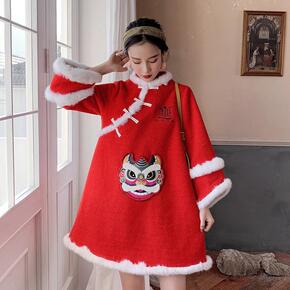 秋冬中国风红色唐装加厚刺绣花改良旗袍女宽松显瘦遮肚...