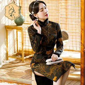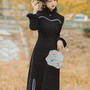 实拍年轻款气质炸街国潮加厚保暖黑色改良旗袍长袖连衣...
