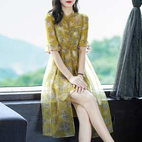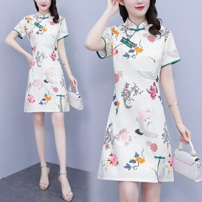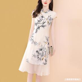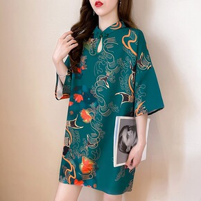 短袖旗袍女改良版印花雪纺连衣裙女夏季中长款2022...