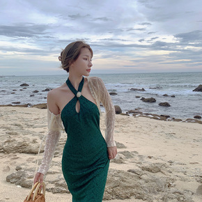 2021复古气质改良旗袍挂脖式开叉中长裙连衣裙两件...