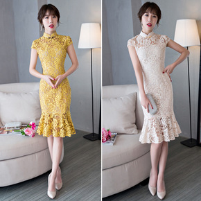 2021夏季新款短袖修身连衣裙淑女一步裙立领复古牡...