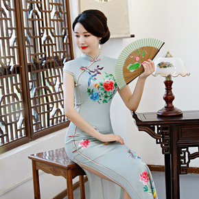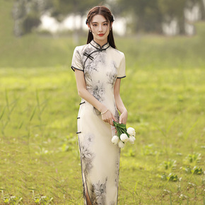 旗袍长款夏季2021年新款民国素雅复古中国风水墨画...