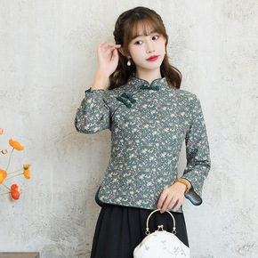 2021秋冬新款旗袍上衣中国风复古唐装斜襟长袖碎花...