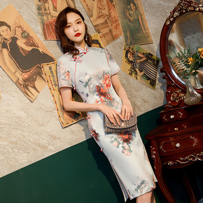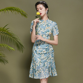 真丝改良旗袍裙2021年夏季新款女修身收腰桑蚕丝碎...
