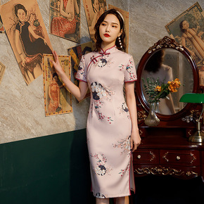 红眸2021春夏新款四面弹旗袍连衣裙三分袖中长款改...