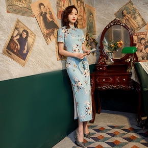 红眸2021春夏新款四面弹旗袍连衣裙三分袖长款改良...