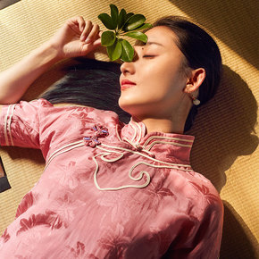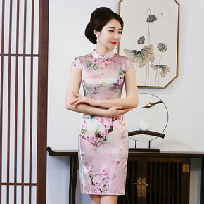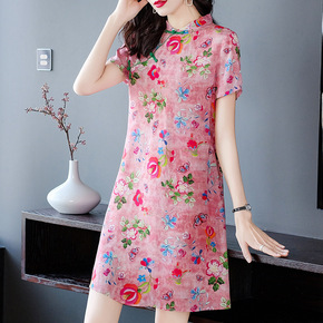 2022春季新款女装中国风桑蚕丝粉色改良旗袍印花真...
