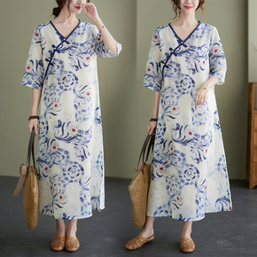 2286实拍#连衣裙夏季复古斜襟珠扣改良旗袍裙宽松...