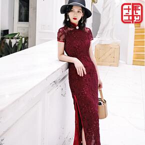 改良长款少女旗袍连衣裙秋复古优雅中国风红色蕾丝新娘...