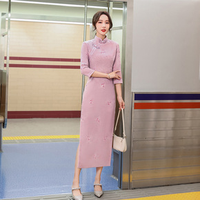 2019新款少女走秀旗袍长款秋季修身演出优雅改良中...