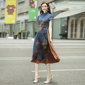 2021夏装新款减龄丝绒印花修身显瘦开叉改良旗袍连...