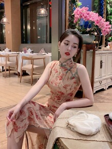 软语呢喃 复古优雅修身国风雪纺改良开叉旗袍无袖连衣...