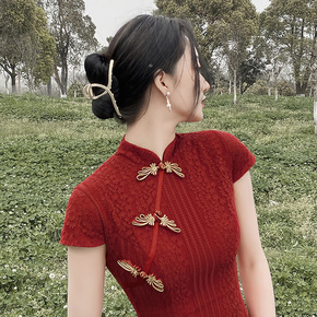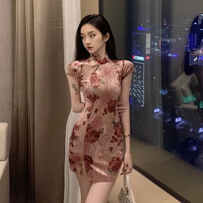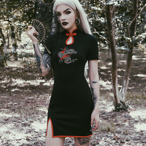 暗黑系女装改良旗袍修身显瘦开叉系扣短袖民国风旗袍复...